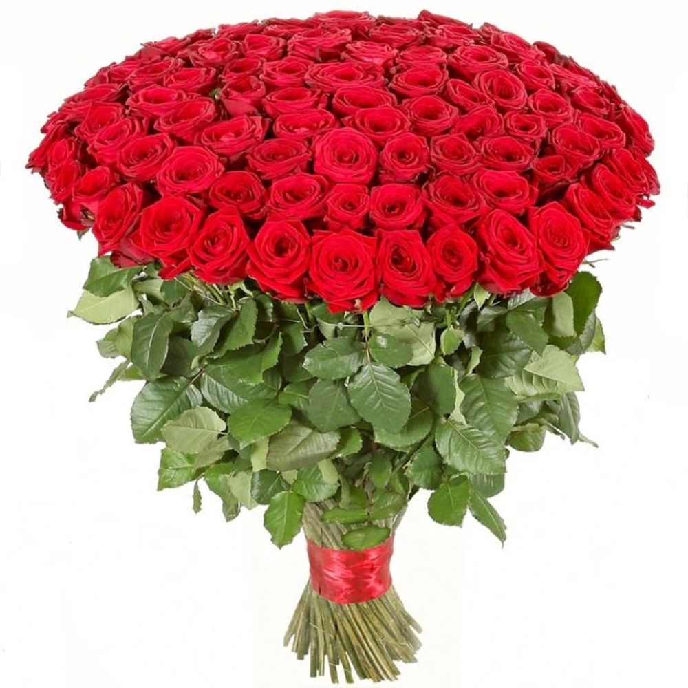 Букет состоит из 101 красная роза, прозрачная упаковка, атласная лента.