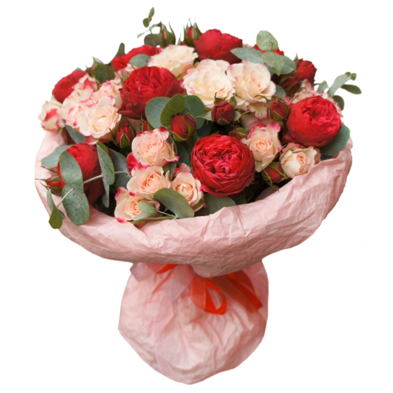 Букет состоит из 6 розовых кустовых роз, 5 красных пионовидных кустовых роз, эвкалипт, крафт, атласная лента.