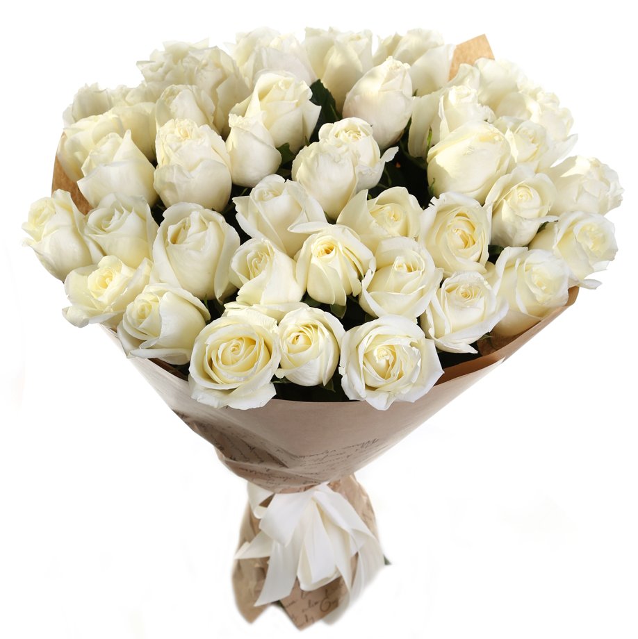 Букет состоит из 51 белая роза, крафт, атласная лента.